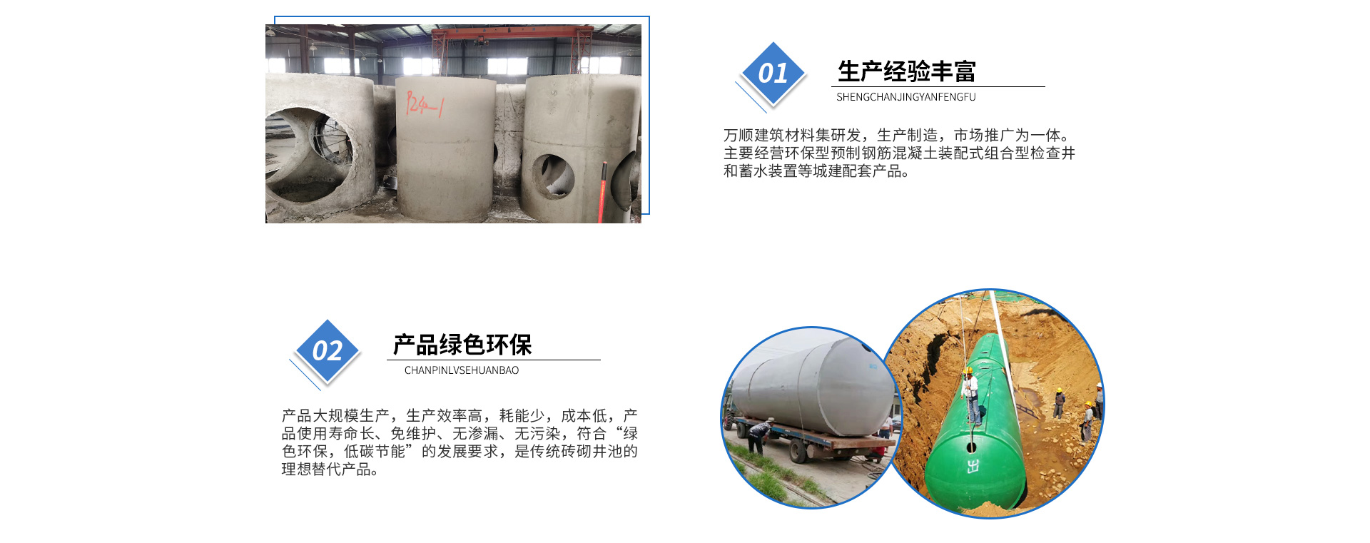 黃山市萬順建筑科技有限公司是集研發(fā),生產(chǎn)制造,市場推廣為一體的綜合性企業(yè)。公司主要經(jīng)營環(huán)保型預制鋼筋混凝土裝配式組合型檢查井和蓄水裝置等城建配套產(chǎn)品。產(chǎn)品生產(chǎn)過程采用獨特的生產(chǎn)工藝,機械化流水作業(yè)。產(chǎn)品大規(guī)模生產(chǎn),生產(chǎn)效率高,耗能少,成本低,產(chǎn)品使用壽命長、免維護、無滲漏、無污染,符合“綠色環(huán)保,低碳節(jié)能”的發(fā)展要求,是傳統(tǒng)磚砌井池的理想替代產(chǎn)品。